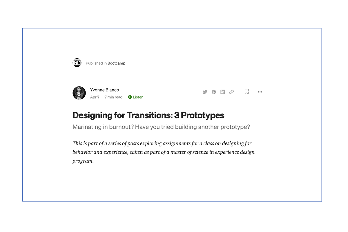 I started writing on Medium to fulfill a requirement for a graduate behavioral design class. After publishing the fifth article, UX Bootcamp picked me up as an author, so I write for them now :)
