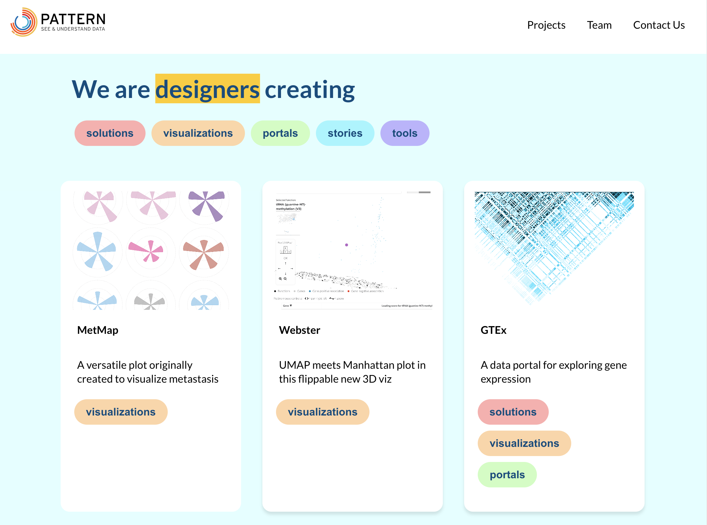 I contributed to the design and site architecture for the official landing site for my team, Pattern. It enables prospective clients to find examples similar to their visualization and design needs.