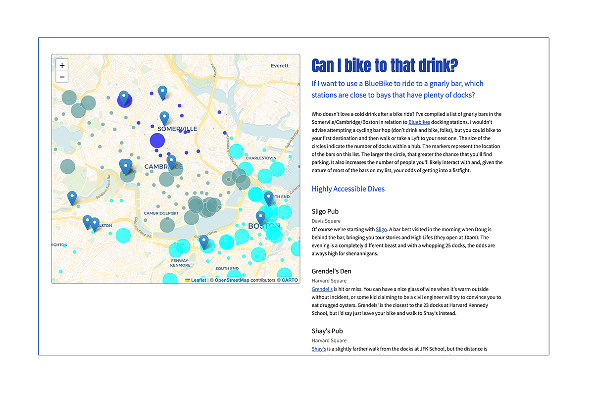 Wanna see how I code? Visit a “Vizfolio” I coded entirely from scratch containing three data visualizations coded in P5.js, Leaflet.js, and D3.js. Right-click to inspect and discover meticulous and hilarious code comments. This was completed as part of my master’s degree requirements in 2022.